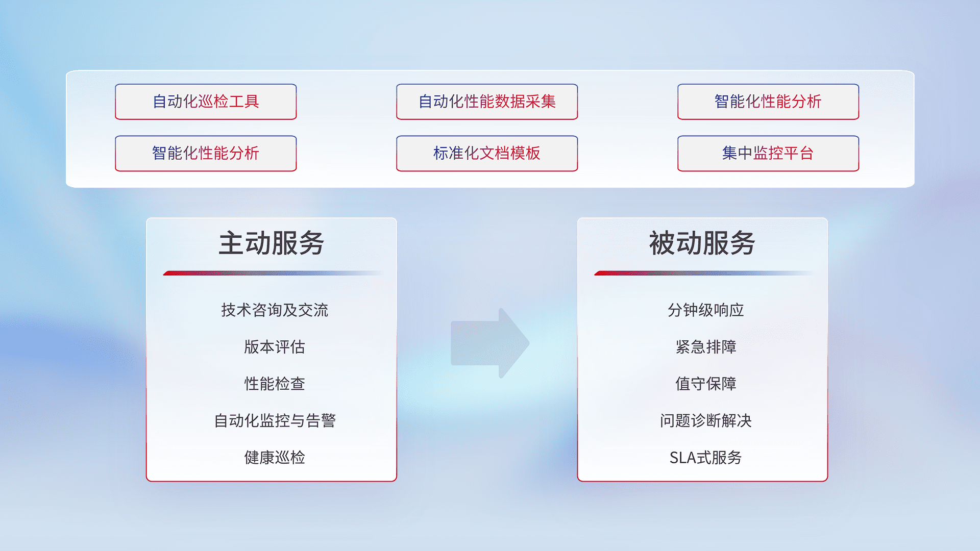 智能化工具和标准化文档,,,,保障服务质量,,提供主动服务(包含技术咨询、、、版本评估、、性能检查、、自动化监控与告警、、健康巡检)和被动服务包含(分钟级响应、、紧急排障、、、值守保障、、问题诊断解决、、、、SLA服务)。。。。
