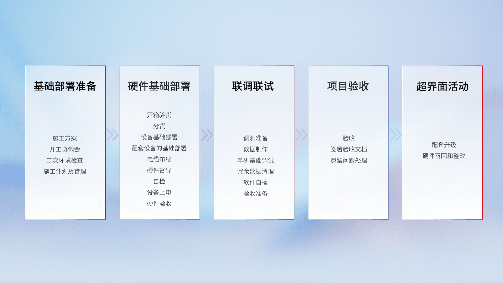 从基础部署准备、、、、硬件基础部署、、、联调联试、、、、项目验收、、、越界面活动的全过程可追溯,,,保证施工质量和进度。。